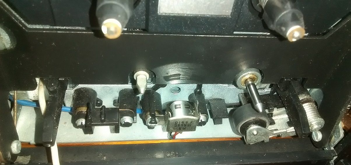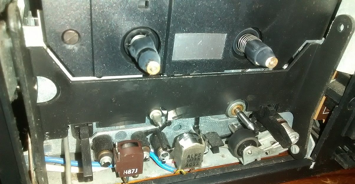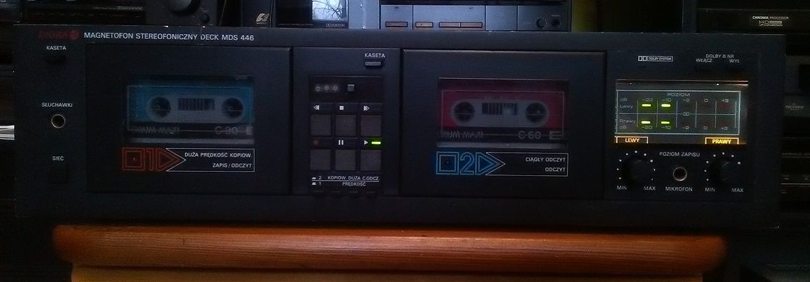 JaKub Opublikowano 16 Stycznia 2019 Opublikowano 16 Stycznia 2019 Prędkość przesuwu taśmy: 4,76 cm/s Prędkość przesuwu taśmy przy kopiowaniu z dużą prędkością: 9,53 cm/s Odchyłka prędkości przesuwu taśmy: ±1,5% Nierównomierność przesuwu taśmy: 0,25% Pasmo przenoszenia: • taśma żelazowa Fe2O3 40÷12500 Hz • taśma chromowa CrO2 40÷14000 Hz • taśma metalowa 40÷14000 Hz Pasmo przenoszenia przy kopiowaniu:z normalną prędkością • taśma żelazowa Fe2O3 40÷12500 Hz • taśma chromowa CrO2 40÷14000 Hz • taśma metalowa 40÷14000 Hzz dużą prędkością dla wszystkich rodzajów taśm) 40÷10000 Hz Stosunek sygnał/szum (ważony) z włączonym układem redukcji szumów DOLBY B dla taśmy chromowej: ≥55 dB Czułość wejść: • LINIA ≤200 mV • MICRO ≤1 mV Impedancja wejściowa: • LINIA ≥47 kΩ • MICRO ≥2 kΩ Napięcie wyjściowe:≥500 mV Poziom zniekształceń: • taśma żelazowa Fe2O3 ≤2% • taśma chromowa CrO2 ≤3% • taśma metalowa ≤3% Dopuszczalny pobór mocy: 30 VA Zasilanie: sieć 220 V - 50 Hz Wymiary: 440x112x260 mm Ciężar: ca 7 kg Mam już trochę polskich decków i wzięło mnie ostatnio na tego MDS 446. Ten na zdjęciu nie jest mój - fotka z netu, ponieważ mój egzemplarz jest dość wymęczony i jak na razie z nim walczę. Kolejny, z panelem w lepszym stanie już w drodze, a na części jest jeszcze McVoice MDS 445, ale do rzeczy... Egzemplarz który dostałem od kolegi jest "pokręcony" i widać ślady czyjejś ingerencji. Widocznie komuś grał "za cicho", bo poziomy odczytu dla obu kieszeni były ustawione na full. Zauważyłem też, że obie kieszenie kręcą za szybko i każda z inną prędkością. Chciałem więc zacząć od ustawienia obrotów i tutaj się trochę zdziwiłem... Regulacja obrotów znajduje się w silnikach, a dojście od nich jest żadne! Zastanawia mnie, jak ustawiali je w fabryce? Jedyne co mi przychodzi do głowy, to że montowali silniki z już ustawionymi obrotami. Zaciekawiło mnie też miejsce na łożysko drugiego koła zamachowego. Może planowali zrobić w nim auto-reverse? Albo konstrukcja mechanizmu została wzięta z jakiegoś magnetofonu z auto-reversem? 3
