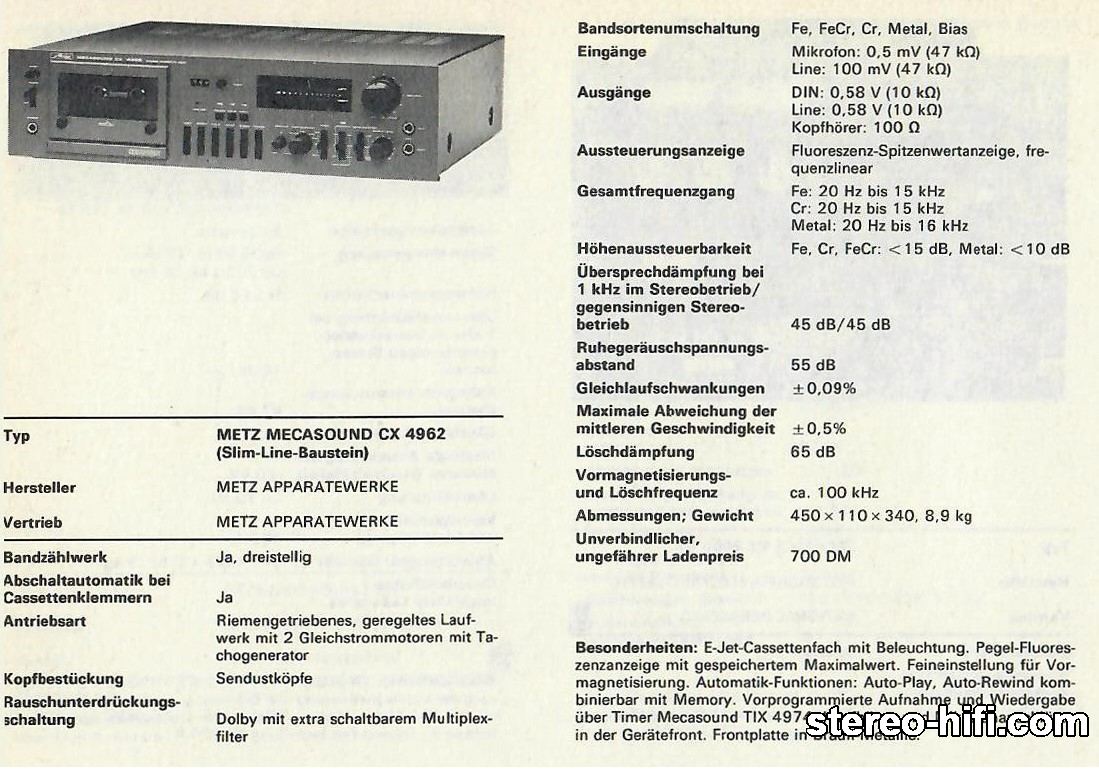 Admin sherlock Opublikowano 14 Czerwca 2019 Admin Opublikowano 14 Czerwca 2019 Metz Mecasound CX 4962-S Mało znana firma z Niemiec. Ja zawsze kojarzyłem ją z produkcją skądinąd świetnych lamp błyskowych. Wedle krążących opinii stawiająca nie na ilość ale na jakość swoich wyrobów. Pierwsze zetknięcie z tym deckiem przywodzi mi na myśl Technicsa RS-M65 fot.hifiengine.com Prawda, że podobny? Deck jest dość ciężki. Waży ponad 9kg co nie dziwi biorąc pod uwagę solidne wykonanie. Prawie zero plastyku - masa metalu. W środku dużo elektroniki z tego co piszą od NEC'a. Ja widzę przekaźnik kontaktronowy żywcem wyjęte z Hitachi. Spowalnianie otwierania kieszeni rodem z ITT. Sporo scalaków firmy Toshiba. Maszyna dwugłowicowa a ma regulację BIAS'u co nie było wtedy często spotykane. Głowica sendustowa. Wyświetlacz można ściemniać, ale potencjometr temu służący znajduje się na tylnej ściance 5
