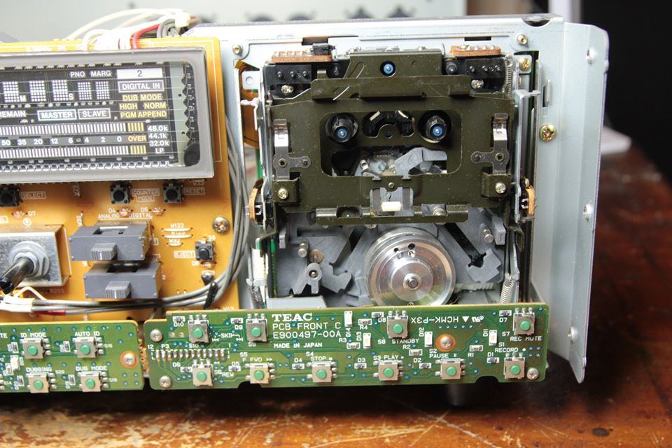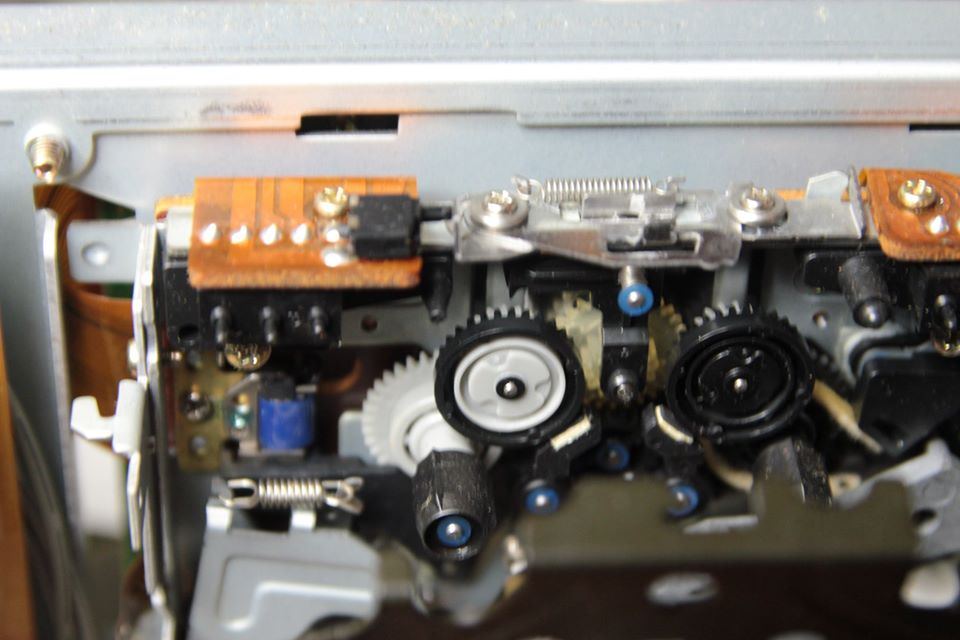 Niecerkiewny Opublikowano 16 Grudnia 2019 Opublikowano 16 Grudnia 2019 (edytowane) Niecodzienny widok dwukieszeniowy DAT. Niecodzienny jest też deck. Tascam zadbał o parametry i wykonanie, piękny design panelu sterowania, na którym jasno widać co klikać... Maszyny te stają się już poczciwe, więc sporo pracy jest nad przywróceniem ich do żywych, ale da się, potrzeba sporo cierpliwości i precyzji, ale się da. Moim zdaniem bardzo ciekawy deck, o dobrych parametrach, szybki, łatwy w operowaniu... ode mnie brawa. Poniżej kilka słów o bolączkach mojego modelu. TASCAM DA-302 Format : Rotary head digital audio tape deck Tape Speed : 8.15 mm/sec. (SP: Recording/playback) 12.225 mm/sec. (only for playback) 16.3 mm/sec. (SP: Double speed dubbing, LP: 4 times normal speed dubbing) 4.075 mm/sec. (LP: Recording/playback) Recording Time : 120 minutes (SP: With a 120-minute tape) 240 minutes (LP: With a 120-minute tape) Fast Winding/Rewinding Time : Approx. 60 seconds (with a 120- minute tape) Channels : Stereo 2 channels Quantization : 16-bit linear (SP), 12-bit non-linear (LP) Error Correction Method : Doubled Reed Solomon code Sampling Rates : 48 kHz (recording/playback) 44.1 kHz (recording/playback) 32 kHz (recording/playback) Emphasis : 50 µsec./15 µsec (automatically applied in the Play mode) Frequency Response : 20 – 20 kHz ± 0.5 dB (48 kHz/44.1 kHz) 20 – 14.5 kHz ± 0.8 dB (32 kHz) S/N : More than 89 dB Dynamic Range : More than 89 dB Total Harmonic Distortion : Less than 0.007% (SP), less than 0.07% (LP) (1 kHz for recording and playback, full-scale) Channel Separation : More than 85 dB (1 kHz) Wow and Flutter : Unmeasurable (less than ±0.001%) Dimensions (WHD)482 x 151 x 353 mm / 19 x 5.9 x 13.9 inch Net weight (2.2 lb = 1 kg)7.2 kg / 15 lb 13.7 oz (15.859 lb) Tak więc dotarł do mnie jako niesprawny i taki też rzeczywiście był. Problem z otwieraniem kieszeni - nie otwierały się wcale. Errory na wyświetlaczach. Potrzeba było trochę rozkminki, aby otworzyć kieszenie, ale udało się, należy igłą odciągnąć taki języczek na górnej części mechanizmu - spust zasilany silniczkiem - a gdy pasek wisi to i nie otwiera... Po rozmontowaniu wszystkiego na drobne części, rozpocząłem poszukiwania usterek. Na pierwszy ogień poszły paski otwierania kieszeni, bardzo malutkie, trochę mi zajęło znalezienie ich gdzieś w sieci. Zasłyszane z netu - o padających kondensatorach na płytkach pcb napędów - tak więc wszystkie wymieniłem. Rozsypane filce na padach hamulcowych - wymiana na nowe - tu dociąłem i dopasowałem z filcu starego hamulca z jakiegoś szpulaka... Oczywiście przeczyszczenie wszystkiego. Oczyszczenie starego twardego smaru na mechanizmach i przesmarowanie nowym fajniutkim . Edytowane 16 Grudnia 2019 przez Niecerkiewny 3