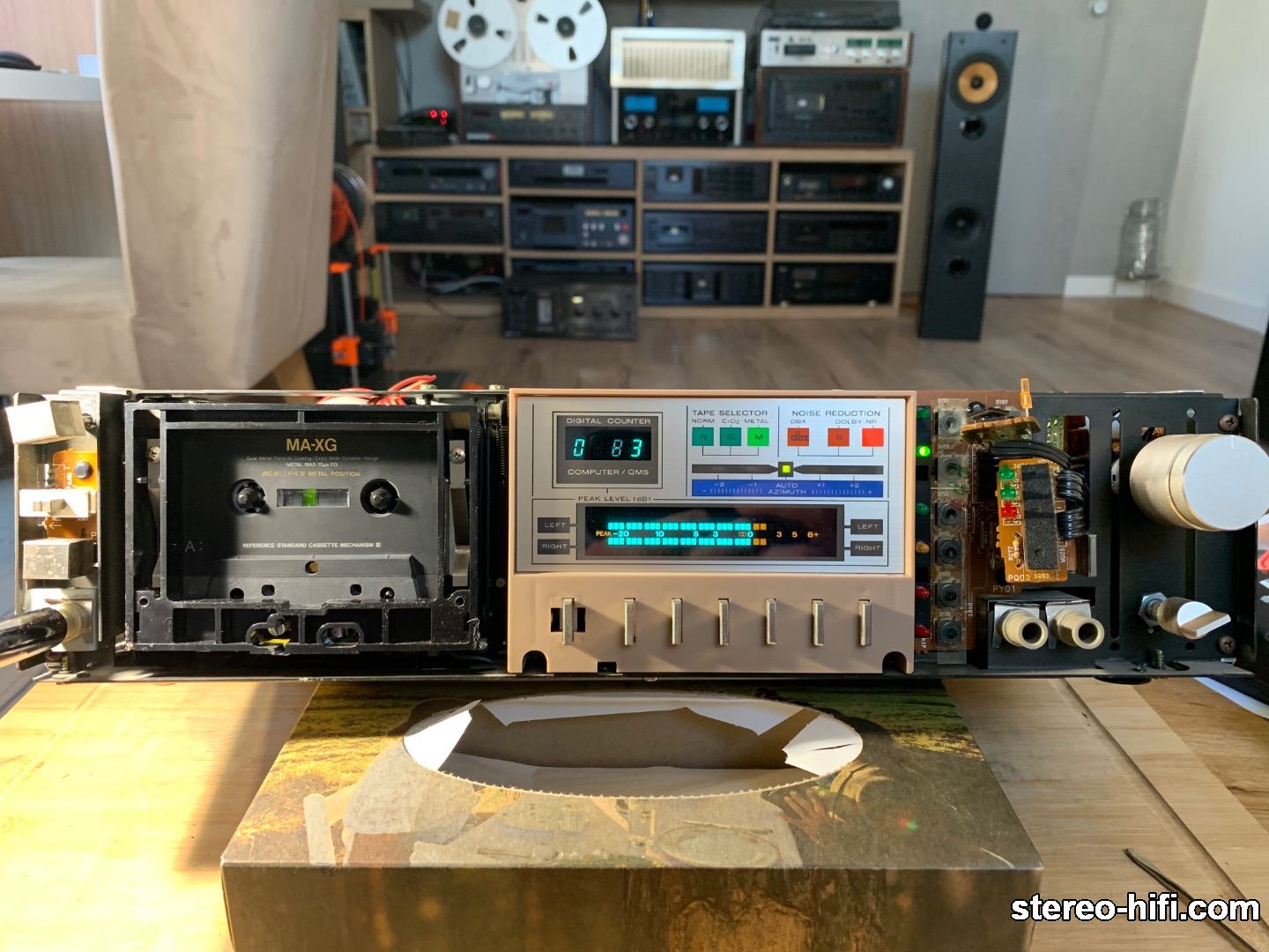 Admin sherlock Opublikowano 31 Grudnia 2019 Admin Opublikowano 31 Grudnia 2019 Marantz SD930 fot. retro.audio Specifications: Type: 3-head, single compact cassette deck Track System: 4-track, 2-channel stereo Tape Speed: 4.75 cm/s Heads: 1 x combination record/playback, 1 x erase Tape Type: type I, CrO2, Metal Noise Reduction: B, C, DBX Frequency Response: 20Hz to 22kHz (Metal tape) Signal to Noise Ratio: 90dB (DBX) Wow and Flutter: 0.03% Input: 70mV (line), 0.3mV (mic) Output: 0.4V (line) Dimensions: 416 x 100 x 300mm Weight: 7.5kg Year: 1983 Pierwszy na świecie magnetofon z automatyczną regulacją azymutu głowicy. Nakamichi kupiło licencję (patent?) i w zmienionej formie zastosowało w kultowym Dragonie. W Marantzu zmiany położenia głowicy dokonywane są za pomocą elementu piezoelektrycznego, który zmienia kształt pod wpływem przyłożonego do niego napięcia. 3
