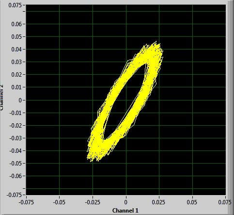 1. Na wykresie w tybie X-Y linia rysuje się w II i IV ćwiartce układu współrzędnych co oznacza, że sygnały obu kanałów są w przeciwfazie (180').