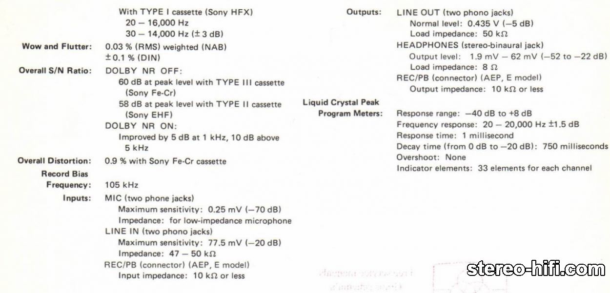 flyingcircus Opublikowano 11 Sierpnia 2017 Opublikowano 11 Sierpnia 2017 Sony TC-K80II Stereo Cassette Deck (1979-81) Dane techniczne : wg http://audio-heritage.jp/SONY-ESPRIT/player/tc-k80.html Type: 2-head, single compact cassette deck Track System: 4-track, 2-channel stereo Tape Speed: 4.75 cm/s Heads: 1 x record/playback, 1 x erase Tape Type: type I, FeCr, CrO2, Metal Noise Reduction: B Frequency Response: 30Hz to 17kHz (FeCr tape) Signal to Noise Ratio: 70dB (dolby B) Wow and Flutter: 0.1% Total Harmonic Distortion: 0.9% Input: 77.5mV (line), 0.25mV (mic) Output: 0.435V (line) Dimensions: 430 x 160 x 295mm Weight: 8.5kg Finish: silver Accessories: wired remote control Year: 1981