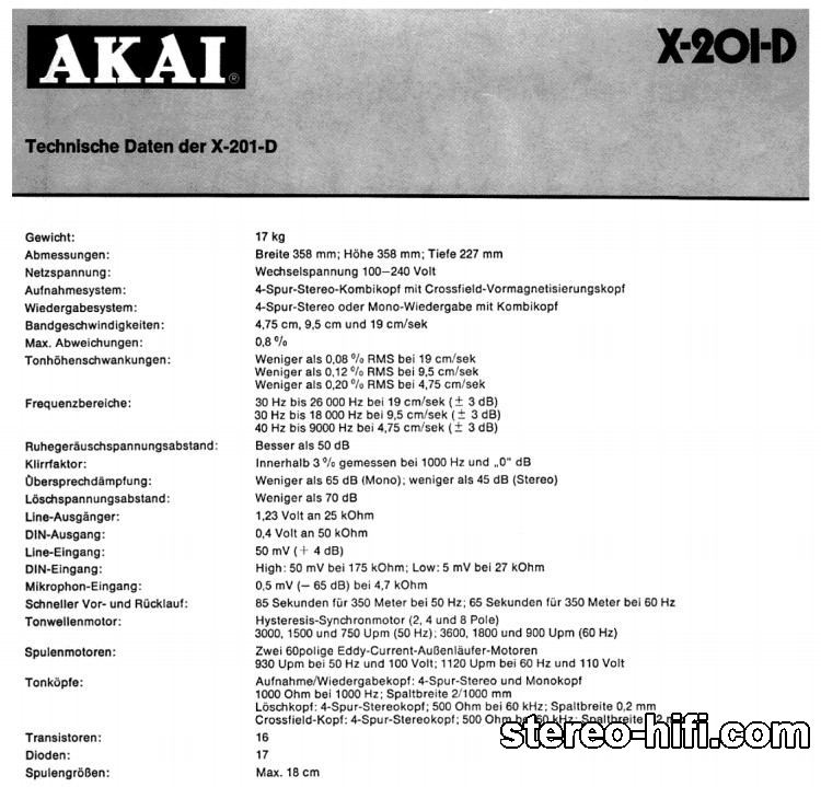 Filwoj Opublikowano 20 Lipca 2020 Opublikowano 20 Lipca 2020 Akai X201D Podstawowe dane techniczne: Track system: 4-track, 2-channel, stereo/monaural system Heads: 1 x record/playback, 1 x erase, 1 x bias Motor: 2 x reel drive, 1 x capstan Reel size: up to 7 inch reel Tape speeds: 1 7⁄8 3 3⁄4 7 1⁄2 ips Wow and flutter: 0.08% (7 1⁄2 ips) Frequency response: 30Hz to 26kHz (7 1⁄2 ips) Signal to Noise Ratio: 50dB Total harmonic distortion: 3% Crosstalk: 45dB Input: 50mV (line), 5mV (DIN), 0.5mV (mic) Output: 1.23V (line), 0.4V (DIN) Semiconductors: 16 x transistors, 17 x diodes Dimensions: 358 x 358 x 227mm Weight: 17kg Magnetofon trafił do mnie ze znanego portalu aukcyjnego kilka (naście ?) lat temu, szukałem wtedy decka na którym mógłbym odtwarzać stare taśmy nagrane jako czterościeżkowe monofoniczne na Damie Pik i na niego padł wybór. Jest raczej nieduży ale dość ciężki - 3 silniki. Posiada autorewers i trzy głowice. Pomimo tego nie daje możliwości podsłuchu podczas realizacji nagrania gdyż ta sama głowica uniwersalna pełni funkcję zapisu i odtwarzania. Osobna odpowiada za wymazywanie sygnału, a trzecia, ustawiona na przeciw uniwersalnej, odpowiada za nagranie na taśmie prądu podkładu BIAS. Magnetofon obsługuje szpule do 7 cali i te największe wystają wyraźnie poza obrys co wygląda bardzo rasowo. Posiada trzy prędkości i do każdej ustawiany przełącznikiem parametr "Equalizer" podczas nagrywania. 2