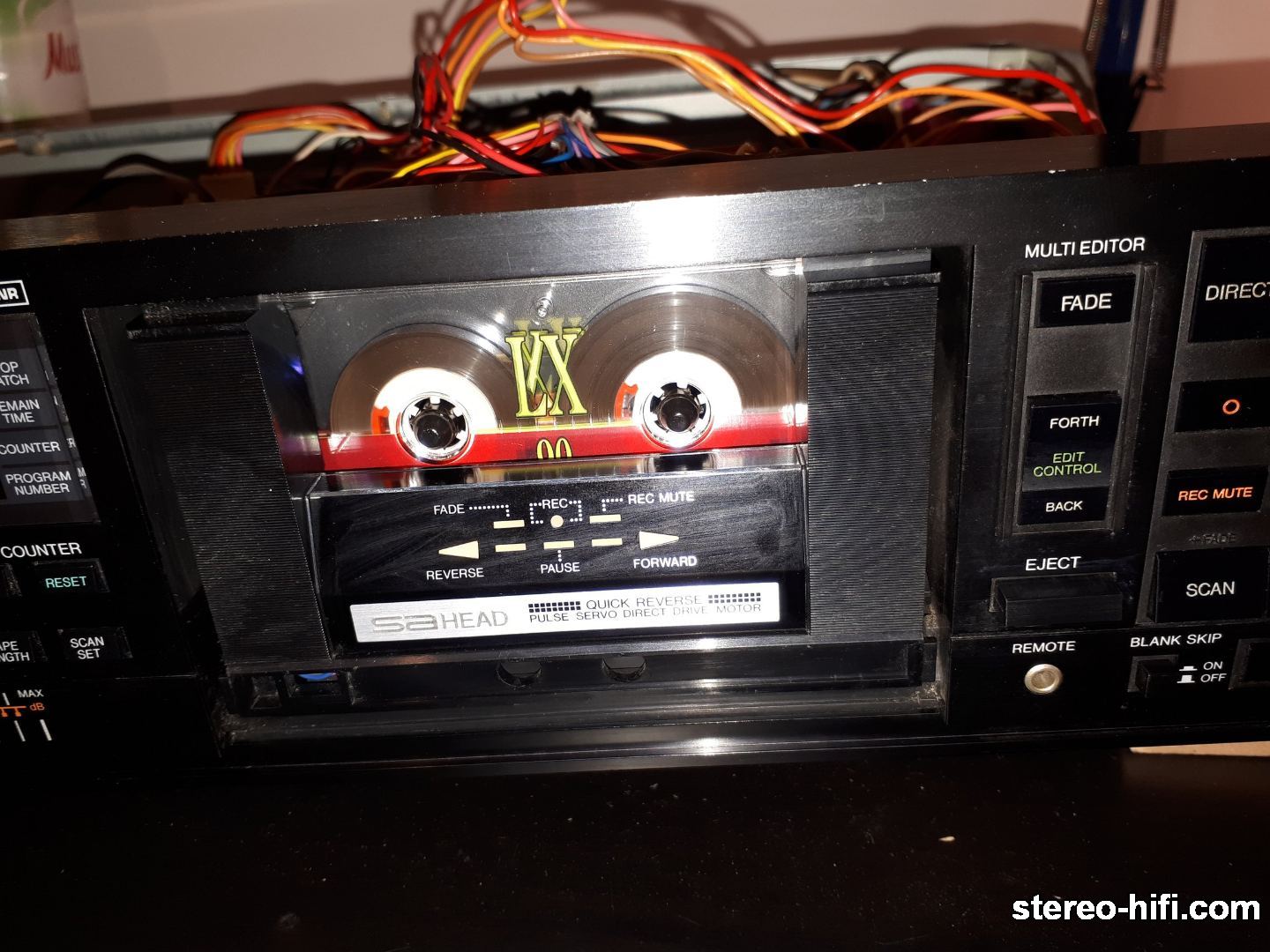 miszczu987 Opublikowano 8 Października 2020 Opublikowano 8 Października 2020 JVC DD-VR77 Witam, ja chciałem pochwalić się swoim skarbem ze stajni JVC z 1986 roku. Przed zagładą uratował go mój tato kilkanaście lat temu, bo już miał trafić na śmietnik. Egzemplarz pochodzi prawdopodobnie z USA, na tabliczce widnieje 120V/60Hz i oczywiście ktoś mądry u nas podłączał go pod 230V... Jest to więc maszyna przerobiona na zasilanie naszym 230V. Najciekawszą funkcją, w którą wyposażony jest ten model jest multi editor. Pozwala on na edycję nagrania już po zapisie na taśmie, przykładowym zastosowaniem jest wyciszanie nagrania przed niechcianym zakończeniem, np. pojawieniem się głosu spikera przy nagrywaniu z radia. Edycja odbywa się przy zmniejszonej prędkości przesuwu. Oczywiście możliwe jest też robienie fade-in/fade-out podczas samego nagrywania, mi się zdarzało używać tej funkcji przy przegrywaniu z vinyla na kasetę. Inną ciekawą funkcją jest pomijanie długich przerw oraz możliwość regulacji głośności na wyjściu liniowym (odpowiada za to pokrętło od słuchawek). JVC potrafi też odtwarzać po kilka sekund z każdego utworu (scan+play) oraz wyszukiwać utwory (scan+rew/ff). Wspomnę jeszcze o bardzo przydatnej i precyzyjnie działającej funkcji pokazywania czasu pozostałego do końca taśmy. Magnetofon posiada auto-reverse i niekoniecznie jest to moja ulubiona funkcja. Od jakiegoś czasu przy odtwarzaniu w przód taśma dziwnie się zachowuje, jakby rolka nie była w stanie jej utrzymać. Oczywiście obie rolki dociskowe są nowe. Podejrzewam jakiś problem ze sprzęgłami/hamulcami na szpulkach - będę jeszcze to badać. W drugą stronę jest bez zarzutu. Sugestie od znawców mile widziane W środku są 2 silniki, w tym jeden direct-drive odpowiadający za koła zamachowe (drugie koło zamachowe napędzane jest poprzez pasek). Drugi silnik to oczywiście szpulki. Na razie dodaję zdjęcia zewnętrzne, mam gdzieś fotografie ze środka, ale muszę je odnaleźć, ponadto czeka mnie zabawa ze wspomnianymi szpulkami, więc na pewno zrobię lepsze Podsumowując, zrobione są: nowy pasek koła zamachowego; nowe rolki dociskowe; nowe microswitche, bo magnetofon zaczynał mylić funkcje; nowy transformator - to już kiedyś i nie ja to robiłem Do zrobienia: sprawdzić sprzęgła/hamulce na szpulkach; Dane techniczne: Frequency response (metal): 20-Hz to 17-kHz (±3-dB) Frequency response (chrome): 20-Hz to 17-kHz (±3-dB) Frequency response (normal): 20-Hz to 16-kHz (±3-dB) SNR (metal): 58-dB Wow and Flutter: 0.08-% Crosstalk: 65-dB (1-kHz) Channel Separation: 40-dB (1-kHz) Number of Heads: 2 Recording Head: Ceramic-Clad Sen-Alloy Playback Head: Ceramic-Clad Sen-Alloy Erase Head: 2-gap Ferrite Motors: Direct-drive pulse servo motor, DC Motor × 2 Fast Forward/Rewind Time: 90-seconds with C60 Line-in Sensitivity/Impedance: 80-mV/80-kΩ Line-out Level/Impedance: 0 to 500-mV/5-kΩ Headphones: 0 to 0.6-mW/8-Ω Dimensions: 435 mm × 110 mm × 282 mm Weight: 5.2 kg 4