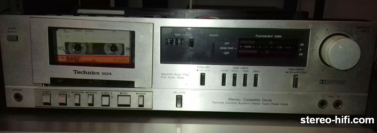 Admin sherlock Opublikowano 6 Września 2017 Admin Opublikowano 6 Września 2017 Technics RS-M24 Dane techniczne: Type: 2-head, single compact cassette deck Track System: 4-track, 2-channel stereo Tape Speed: 4.8 cm/s Heads: 1 x record/playback, 1 x erase Motor: electrical governor DC Tape Type: type I, CrO2, Metal Noise Reduction: B Frequency Response: 20Hz to 18kHz (Metal tape) Signal to Noise Ratio: 67dB (dolby B) Wow and Flutter: 0.05% Input: 60mV (line), 0.25mV (mic) Output: 0.7V (line) Dimensions: 430 x 119 x 282mm Weight: 5kg Fotka chwilowo z sieci. Mój egzemplarz leży na oddziale OIOM, jest w wersji ciemnej i na dodatek stan ciężki, aczkolwiek stabilny. Środek decka z wymontowanym już mechanizmem oraz widok na tor przesuwu z głowicami. Mechanizm wymontowany. Wymontowany też główny 'winowajca' - silnik, który po prostu zatarł się. Po rozebraniu i wyczyszczeniu zaaplikowałem mu smar ceramiczny w sprayu i śmiga jak młody źrebak. Widok na transformator oraz wyświetlacz z płytka sterująca. Wyświetlacz dziwnie znajomo wygląda. 2
