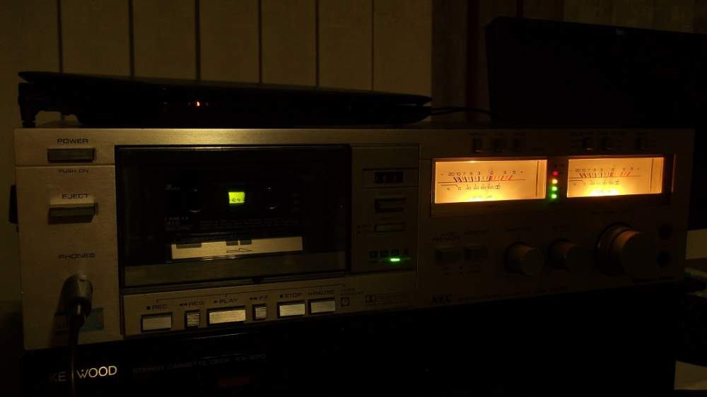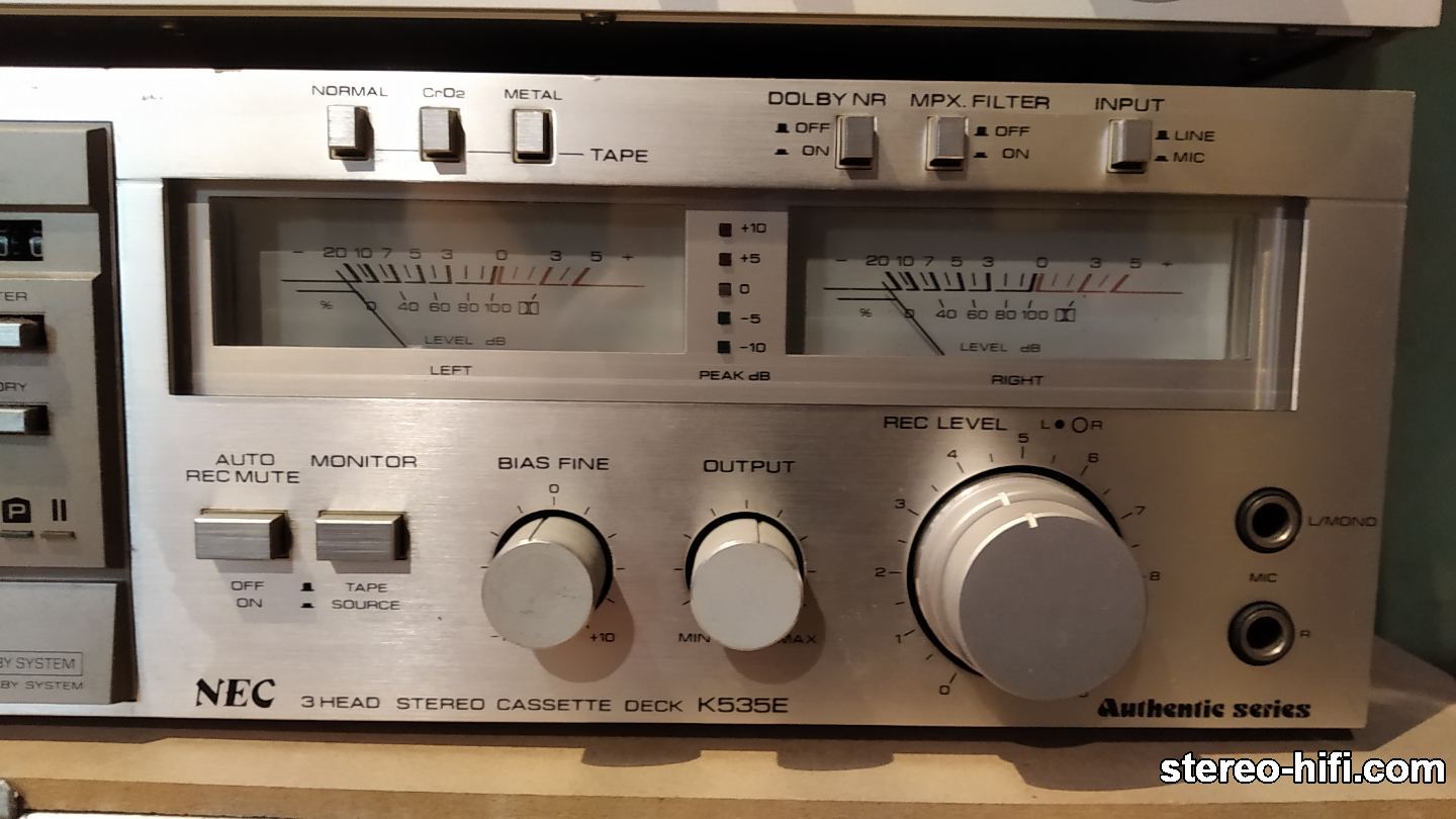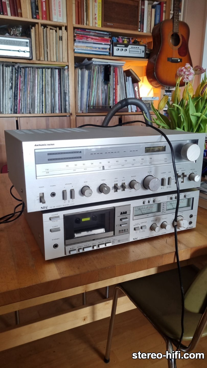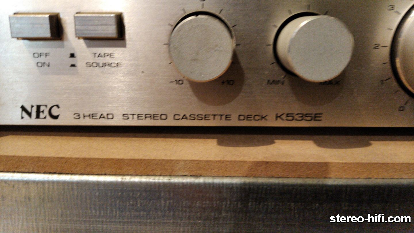 Admin sherlock Opublikowano 19 Września 2017 Admin Opublikowano 19 Września 2017 Nec K535E Dane techniczne: Type: 3-head, single compact cassette deck Track System: 4-track, 2-channel stereo Tape Speed: 4.75 cm/s Heads: 1 x combination record/playback, 1 x erase Motor: 1 x DC servo controlled Tape Type: type I, CrO2, Metal Noise Reduction: B Frequency Response: 20Hz to 20kHz (Metal tape) Signal to Noise Ratio: 70dB (dolby B) Wow and Flutter: 0.04% Total Harmonic Distortion: 2% Input: 60mV (line), 0.25mV (mic) Output: 0.58V (line) Dimensions: 430 x 110 x 310mm Weight: 7.5kg Świeży nabytek. Będzie trochę pracy przy nim. Podświetlenie prawego wskaźnika 'robione':zamiast jednej poziomej żarówki ktoś wmontował 3 mniejsze. Na szczęście mam z jakiegoś starego Akai identyczne to wstawię właściwą. Po włączeniu decka w słuchawkach słychać cichutkie brumienie. Typowy przydźwięk sieciowy. Odtwarza ładnie (pomijając to cichutkie brumienie, którego nie słychać gdy gra muzyka). Z nagrywaniem już większy problem. Nie kasuje poprzedniego zapisu, w prawym kanale jest stary zapis a w lewym nowy nałożony na stary. Przyjdzie kolej to się go zrobi. Fotka głowic: 1 1