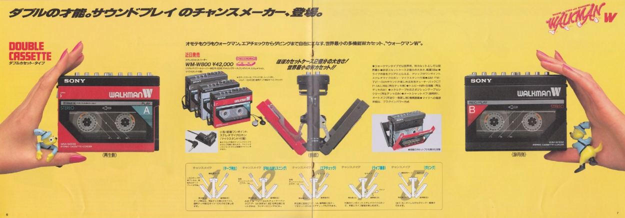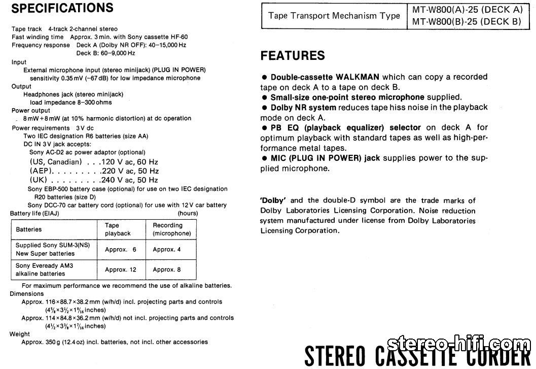 flyingcircus Opublikowano 28 Września 2017 Opublikowano 28 Września 2017 Sony WM-W800 Portable Stereo Cassette Recorder (1986) Description https://www.hifiengine.com/manual_library/sony/wm-w800.shtml The WM-W800 is a double cassette walkman which can copy a recorded tape on deck A to a tape on deck B. The Dolby NR system reduces tape hiss in the playback mode on deck A. A playback EQ selector on deck A gives optimum performance with standard or high performance tapes. The plug in power MIC jack supplies power to the supplied one point stereo microphone. SpecificationsType: Cassette Recorder Tape Type: type I, Metal Noise Reduction: B Output: 8mW Battery: 2 x AA Power Supply: 3V DC Dimensions: 116 x 88.7 x 38.2mm Weight: 350g Year: 1986 2