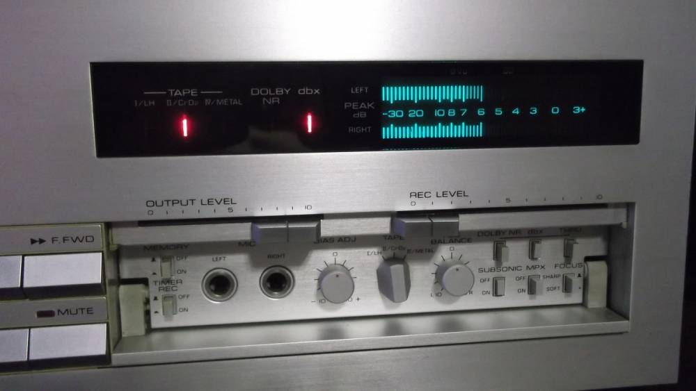 Admin sherlock Postat Iunie 6, 2017 Admin Postat Iunie 6, 2017 Yamaha K-960 Natural Sound specyfikacja: Type: 2-head, single compact cassette deck Track System: 4-track, 2-channel stereo Tape Speed: 4.75 cm/s Heads: 1 x record/playback, 1 x erase Motor: 1 x reel, 1 x capstan Tape Type: type I, CrO2, Metal Noise Reduction: B, DBX Frequency Response: 30Hz to 22kHz (Metal tape) Signal to Noise Ratio: 100dB (DBX) Wow and Flutter: 0.028% Total Harmonic Distortion: 1.0% Input: 50mV (line), 0.3mV (mic) Output: 0.34V (line) Dimensions: 435 x 141 x 306mm Weight: 8kg Year: 1981 Link do artykułu na portalu poniżej. Znajdziecie tam więcej zdjęć zarówno z zewnątrz jak i od środka. 1