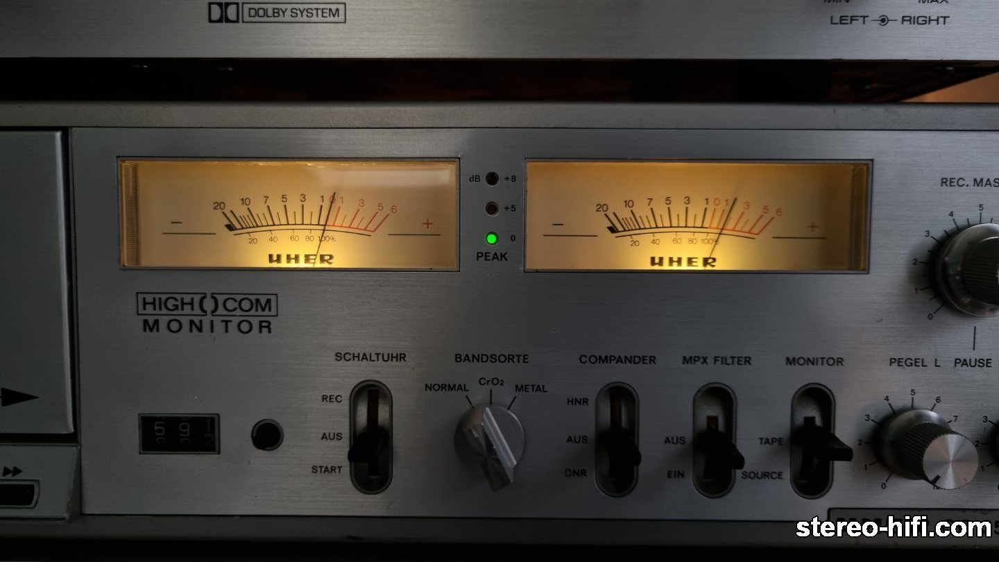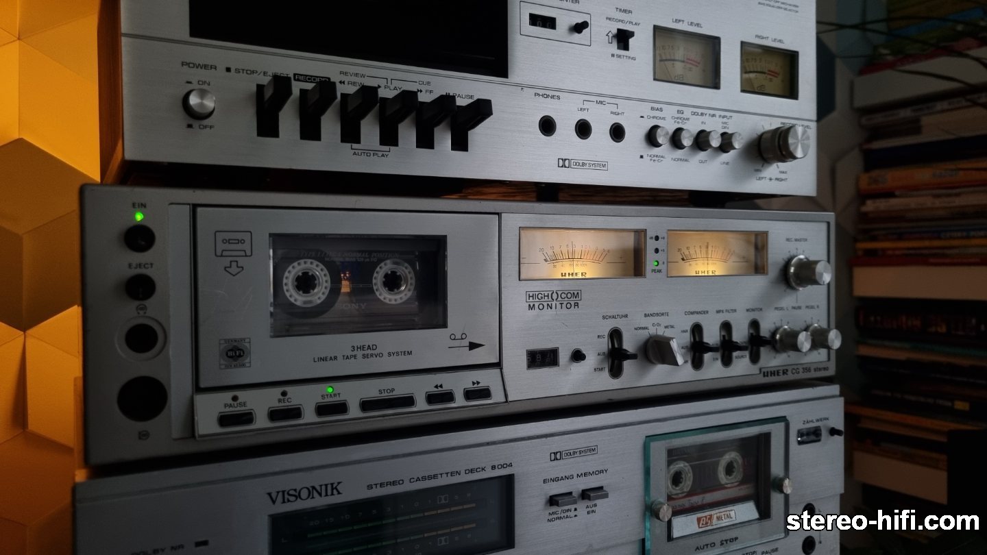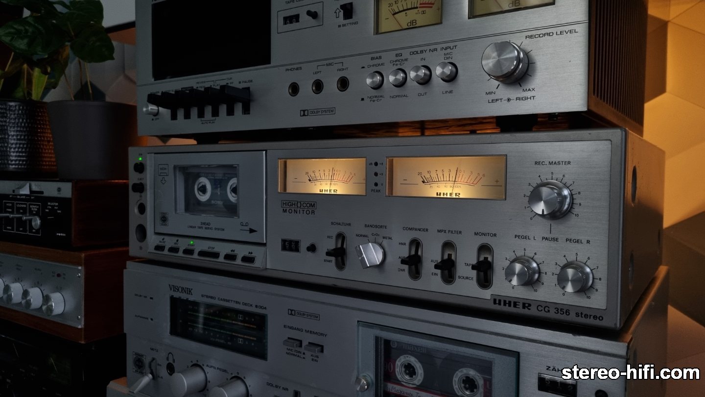 artekk Opublikowano 9 Marca 2018 Opublikowano 9 Marca 2018 UHER CG-356 Niezwykle rzadki trzygłowicowy magnetofon UHERa. W gruncie rzeczy bazuje na deckach firmy Denon z serii DR-F (DR-F1, DR-2, DR-F3) oraz DR-320 i DR-330. Mechanizmy, głowice są identyczne, zasilacze bardzo podobne. Płyty główne są inne, bo Uher posiada układy redukcji szumów HighCom (zapis/odczyt) oraz Dolby B tylko dla odczytu taśm, zaś Denony jedynie Dolby (zapis/odczyt). Magnetofon kosztował w 1982 roku w Niemczech 1250DM. Deck wg mnie bardzo urodziwy, a urodę zawdzięcza głównie pięknym szerokim wychyłowym wskaźnikom wysterowania. Równie stylowe są subtelnie wykończone pokrętła, hebelki i klawisze sterujące mechanizmem magnetofonu. Dziwnym zabiegiem jest mieszanie opisów funkcji na płycie czołowej, część w języku angielskim, a część w niemieckim. Deck zakupiony jako uszkodzony. Wystarczyło wymienić główny pasek, aby ożył. Dostał też nowy pasek do licznika, na którym jest czujnik Halla odpowiadający za autostop, później standardowa konserwacja mechanizmu, przełączników i regulacje, w zasadzie kosmetyczne. Mechanizm z elektromagnesami obsługującymi kluczowe funkcje nie należy do najcichszych i sporo brakuje do kultury pracy japońskiej konkurencji z początku lat 80-tych. W zamian działa bardzo pewnie i szybko, sprawnie przełączając wybrane opcje. Silniki pochodzą od Sankyo. Wnętrze zostało upakowane elektroniką. Znajdziemy tu rozbudowany zasilacz z kondensatorami Nippon Chemicon, sporych gabarytów płytkę sterującą mechanizmem i płytę główną szczelnie wypełniającą obudowę magnetofonu. Układy Dolby pochodzą od Hitachi (Andrzej się ucieszy ), a HighCom do Telefunkena. Głowica kombinowana zapis/odczyt to świetny czarny ALPS. Jak dotąd nie spotkałem słabo brzmiącego decka z taką głowicą na pokładzie. Mechanizm z jednym wałkiem ma sprytny patent zapewniający właściwy naciąg taśmy, pod postacią prowadnicy taśmy na długim ramieniu (skan z katalogu Denon, Uher chyba to przemilczał). Należy wspomnieć o sporych rozmiarów płytce za mechanizmem, jak sądzę dostarczającej "odpowiedniej jakości" prąd dla silników. Unikalną funkcją, która po raz pierwszy spotkałem w magnetofonie jest "pauza" na pokrętle poziomu zapisu. Otóż potencjometr poziomu zapisu posiada wyłącznik. Gdy zmniejszamy poziom do zera, gałka na końcu "przeskakuje" i deck przechodzi na "pauzę". Deck brzmi na swój sposób wyjątkowo. Kto lubi granie w stylu NADów, Onkyo TA-2070 etc. nie zawiedzie się. Spójnie, dynamicznie, namacalnie. Nak ZX-7 to przy Uherze magnetofon do poduszki. Uher gra jakby był na sterydach, szerokim i głębokim dźwiękiem. Może brakuje trochę subtelności, planktonu dźwiękowego, ale tak właśnie odbieramy muzykę na żywo, bezpośrednio, bez kompresji. Nagrywanie i odtwarzanie wychodzi Uherowi na równie wysokim poziomie, choć widać, że skalibrowany jest do Basfów, bo na japońskich kasetach za bardzo podbija poziom i wysokie tony. Regulacji biasu i czułości nie ma, więc trzeba sobie skalibrować magnetofon pod ulubione taśmy, lub poszukać takich, z którymi będzie brzmiał najbliżej źródła. A wtedy gwarantuję, że uśmiech szybko nie zejdzie z twarzy Bracia od Denona : 1