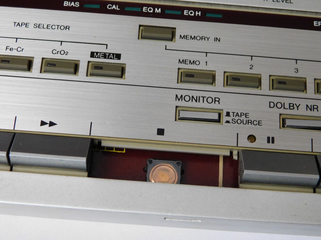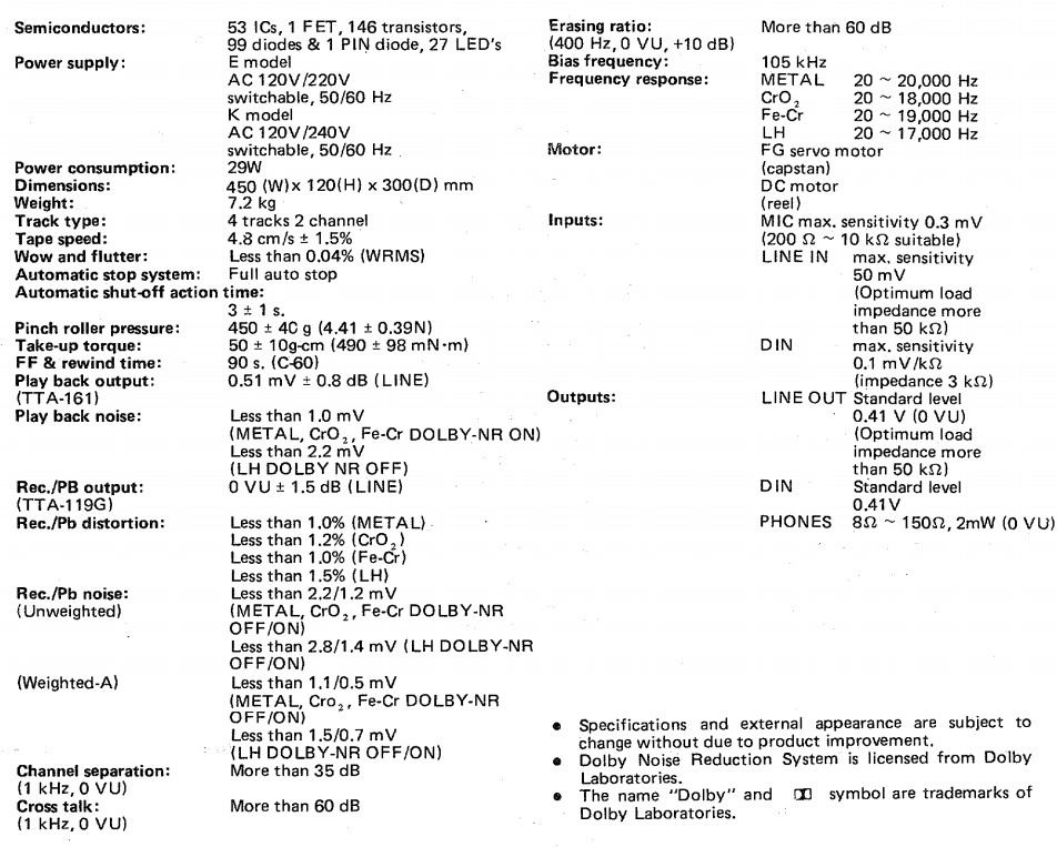 Admin sherlock Opublikowano 21 Marca 2018 Admin Opublikowano 21 Marca 2018 Aiwa AD-M800 Dane techniczne: Type: 3-head, single compact cassette deck Track System: 4-track, 2-channel stereo Tape Speed: 4.8 cm/s Heads: 1 x combination record/playback, 1 x erase Motor: 1 x capstan, 1 x reel Tape Type: type I, FeCr, CrO2, Metal Noise Reduction: B Frequency Response: 20Hz to 20kHz (Metal tape) Wow and Flutter: 0.04% Total Harmonic Distortion: 1.5% Input: 50mV (line), 0.3mV (mic) Output: 0.41V (line) Semiconductors: 53 x IC, 1 x FET, 143 x transistors, 98 x diodes, 27 x LED Dimensions: 450 x 120 x 300mm Weight: 7.2kg Year: 1980 Chyba niekwestionowany "król" w kategorii na największa ilość zastosowanych układów scalonych zastosowanych w magnetofonie kasetowym: 53 sztuki. Imponująca liczba. 2
