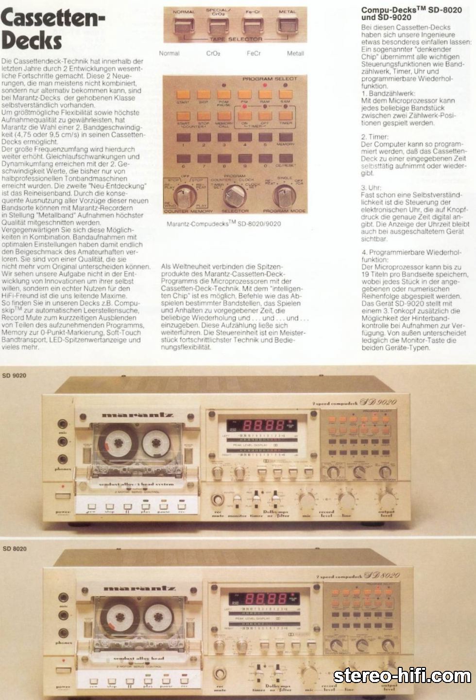 Admin sherlock Opublikowano 9 Maja 2018 Admin Opublikowano 9 Maja 2018 Marantz SD8020 Dane techniczne: Type: 2-head, single compact cassette deck Track System: 4-track, 2-channel stereo Tape Speed: 4.75, 9.5 cm/s Heads: 1 x record/playback, 1 x erase Motor: 2 x DC servo Tape Type: type I, FeCr, CrO2, Metal Noise Reduction: B Frequency Response: 25Hz to 20kHz (Metal tape) Signal to Noise Ratio: 69dB (dolby B) Wow and Flutter: 0.05% Input: 70mV (line), 0.25mV (mic) Output: 0.65V (line) Semiconductors: 91 x transistors, 71 x diodes, 7 x IC, 18 x LED Dimensions: 416 x 146 x 295mm Weight: 10kg Years of manufacture: 1982 - 1984 Nabytek od Kolegi z forum. Ostatni Wielki Mohikanin można by o nim rzec. Wygląd robi wrażenie, waga również. To nie jest cherlawy japoński deck z lat 90-tych, jeśli już to zawodnik sumo. W środku sporo elektroniki, nawet jak na standardy takich w elektronikę "wypasionych". Dostęp do niektórych jak widać trochę utrudniony. Uwagę zwraca dość rozbudowana sekcja zasilania. Co ciekawe wg instrukcji serwisowej deck pobiera z sieci ponad 60W, więc jak na tego typu sprzęt dość sporo. Zwróciliście uwagę na jeden szczegół? Dwa transformatory. Robi się interesująco. 2